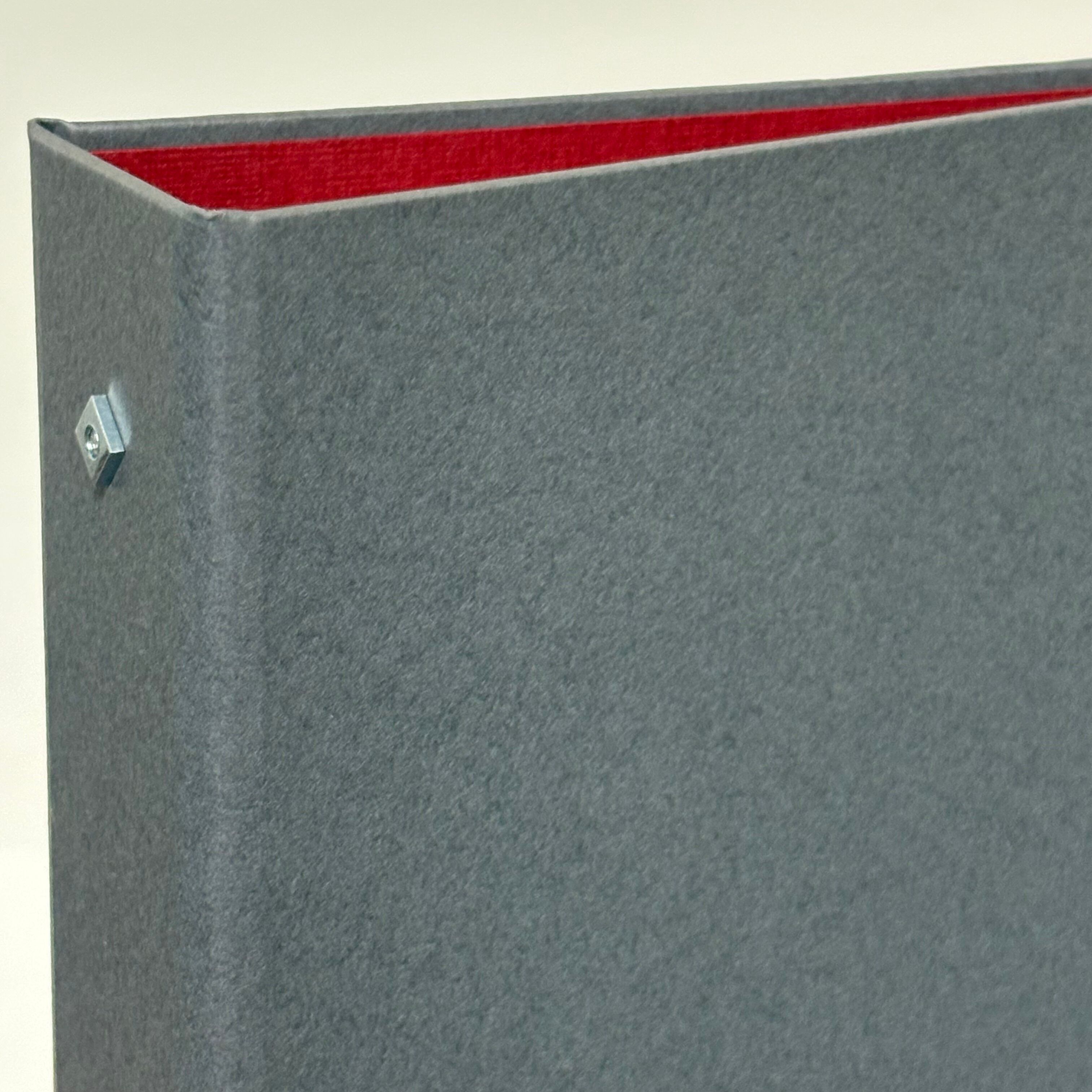 金具を留めるためのナットが背表紙にくっついたデザインとなっています。