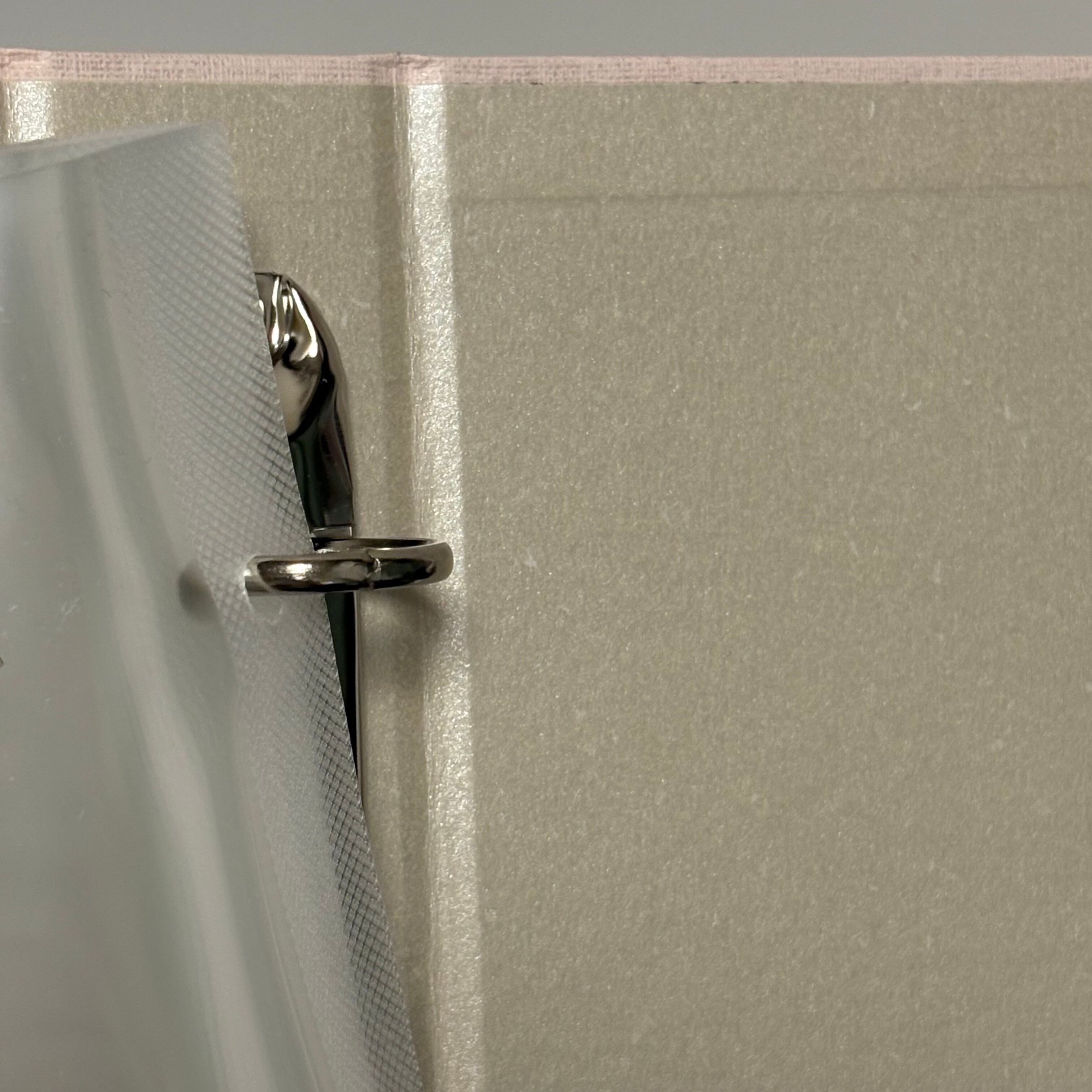 金具を留めるためのナットが背表紙にくっついたデザインとなっています。