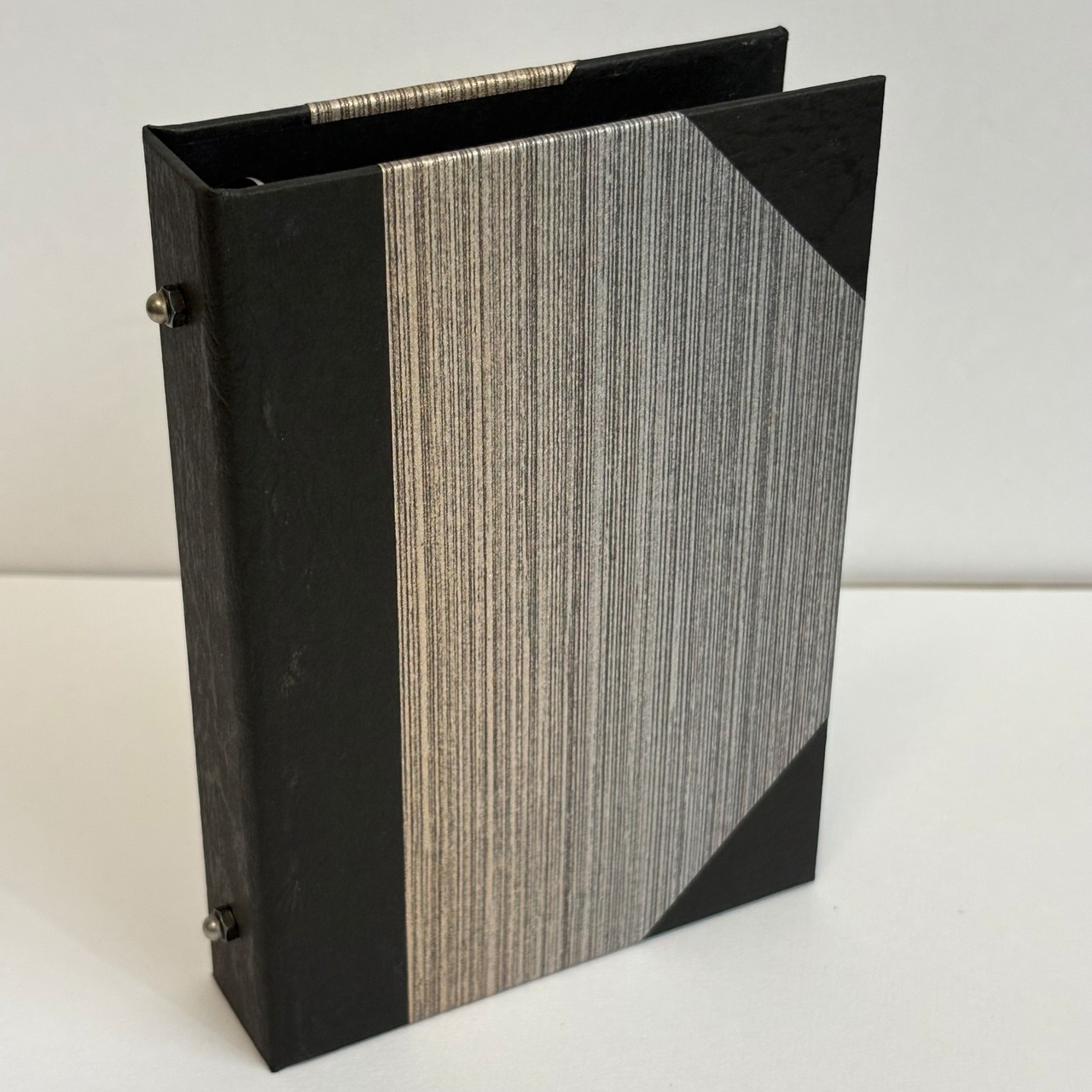 金具を留めるためのナットが背表紙にくっついたデザインとなっています。