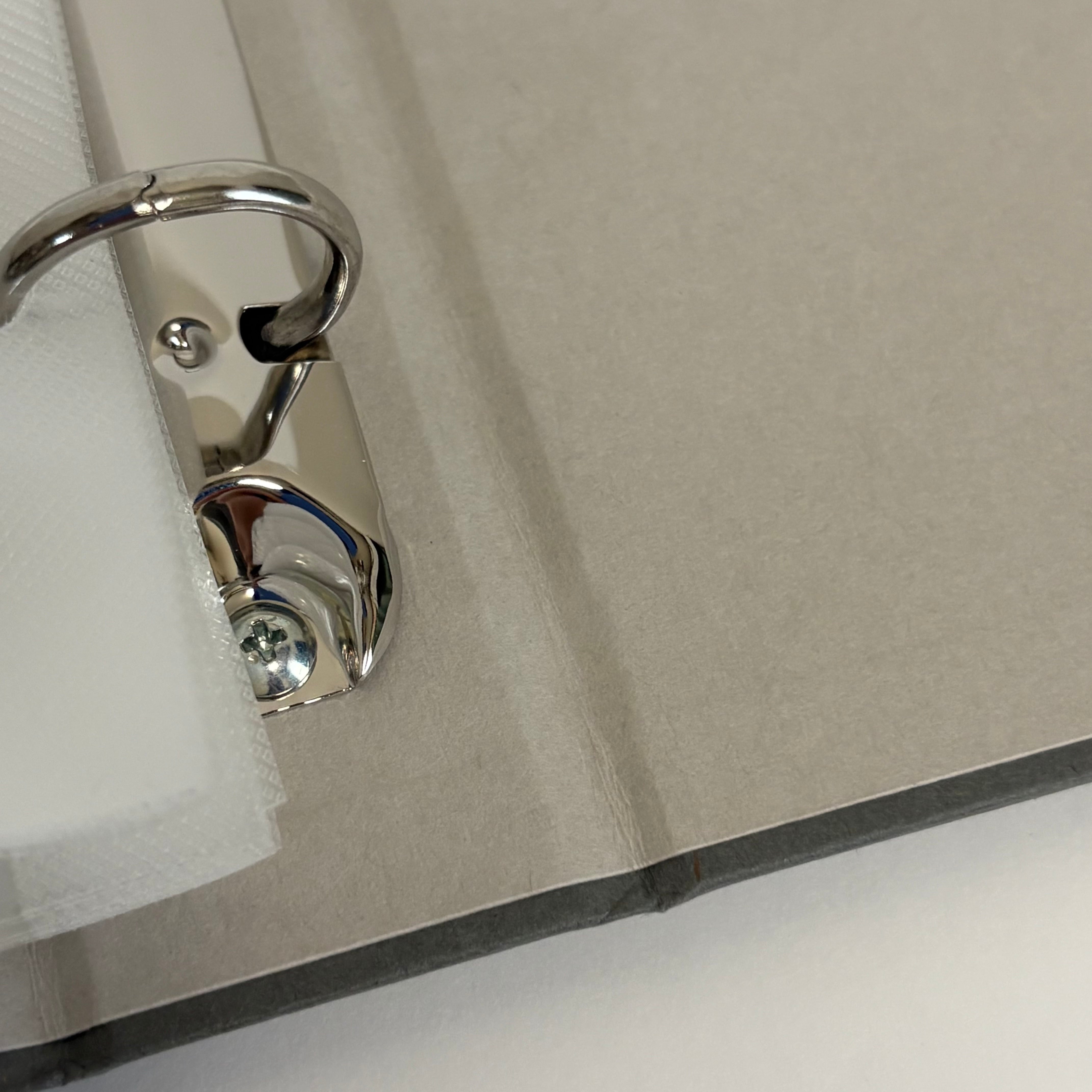 金具を留めるためのナットが背表紙にくっついたデザインとなっています。