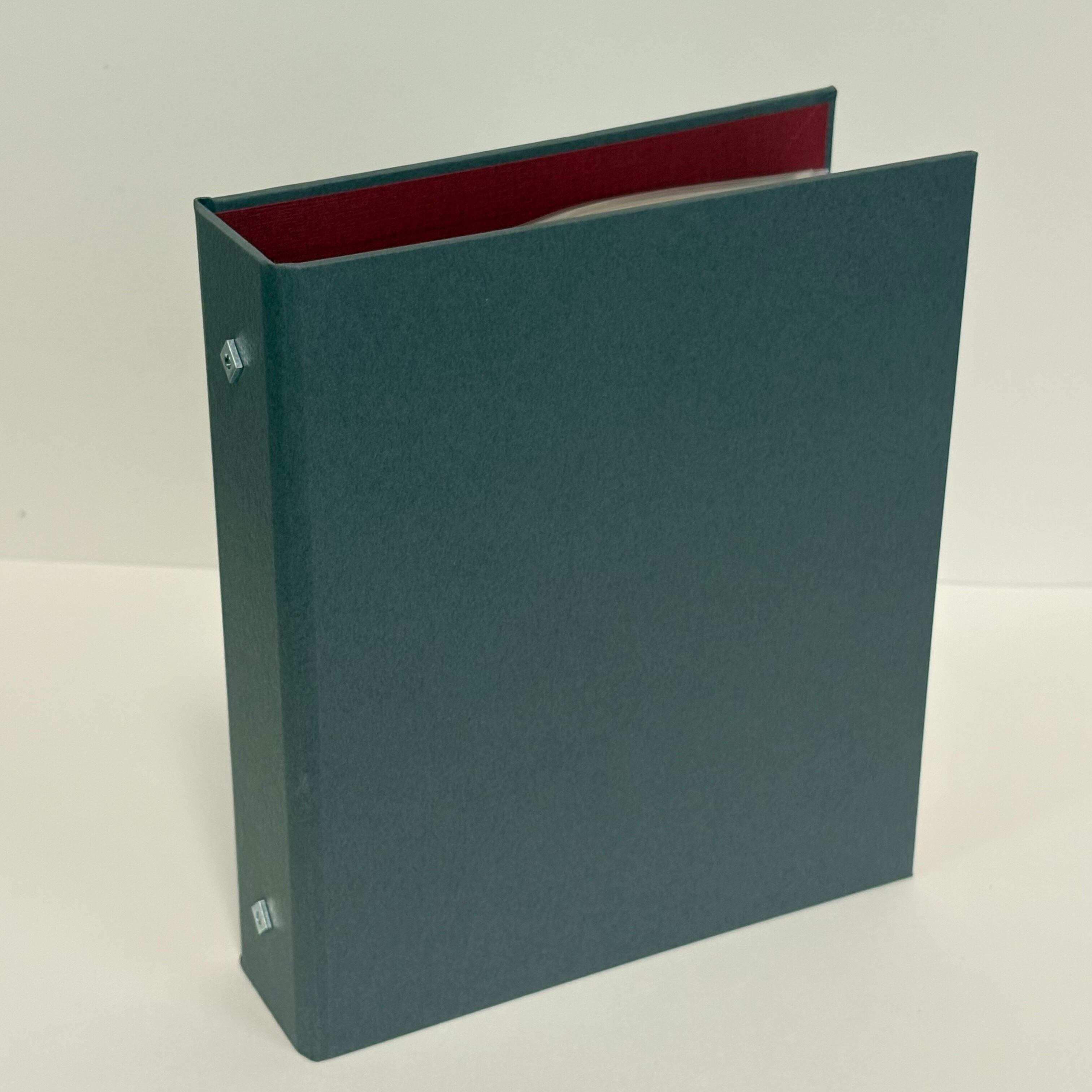 金具を留めるためのナットが背表紙にくっついたデザインとなっています。