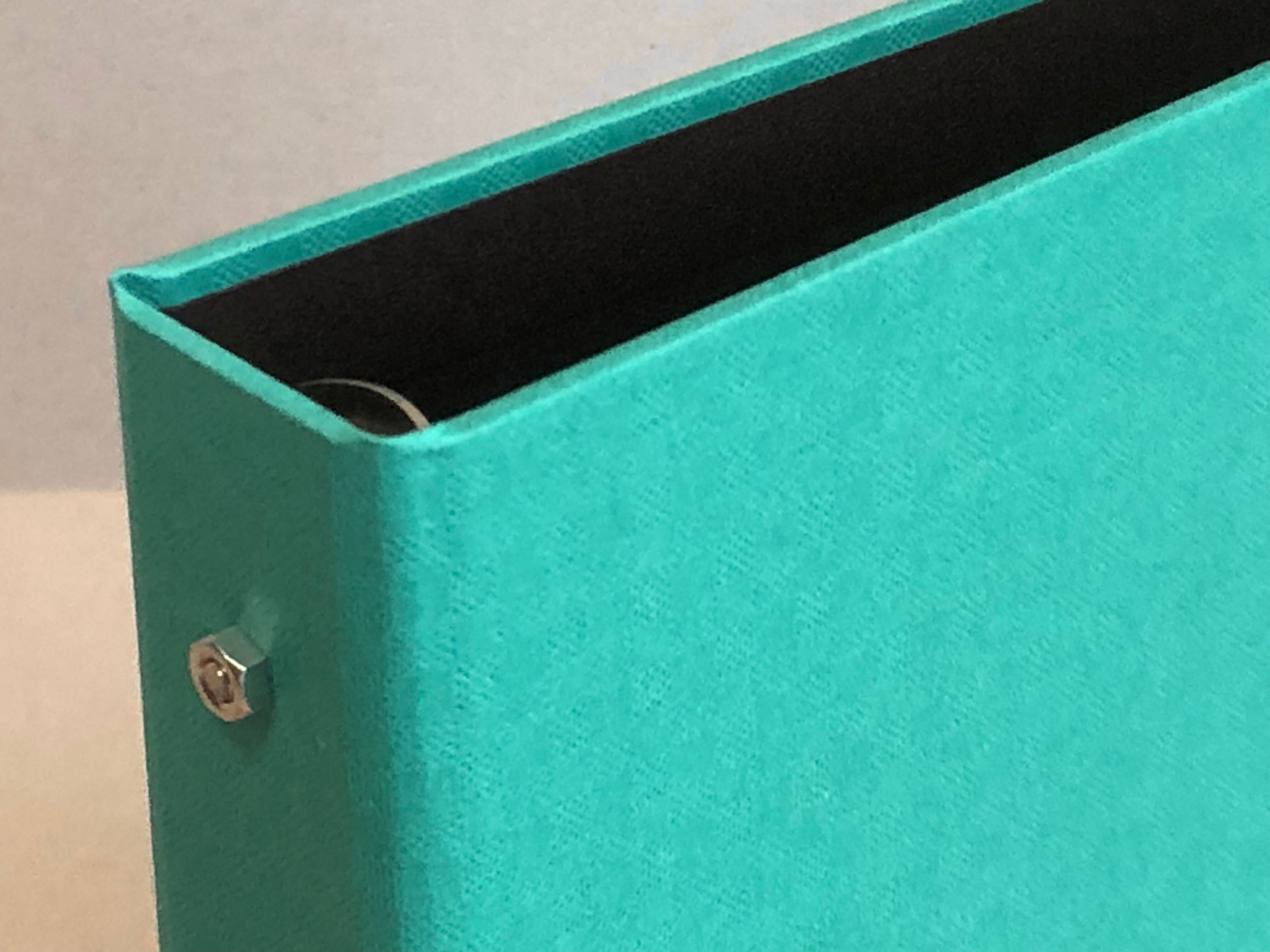 金具を留めるためのナットが背表紙にくっついたデザインとなっています。