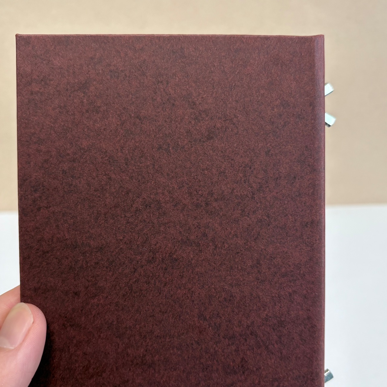 金具を留めるためのナットが背表紙にくっついたデザインとなっています。